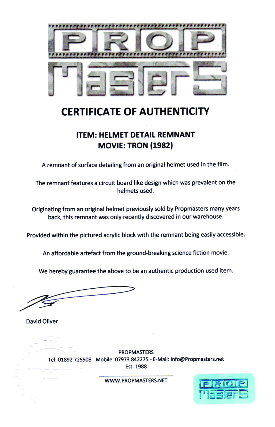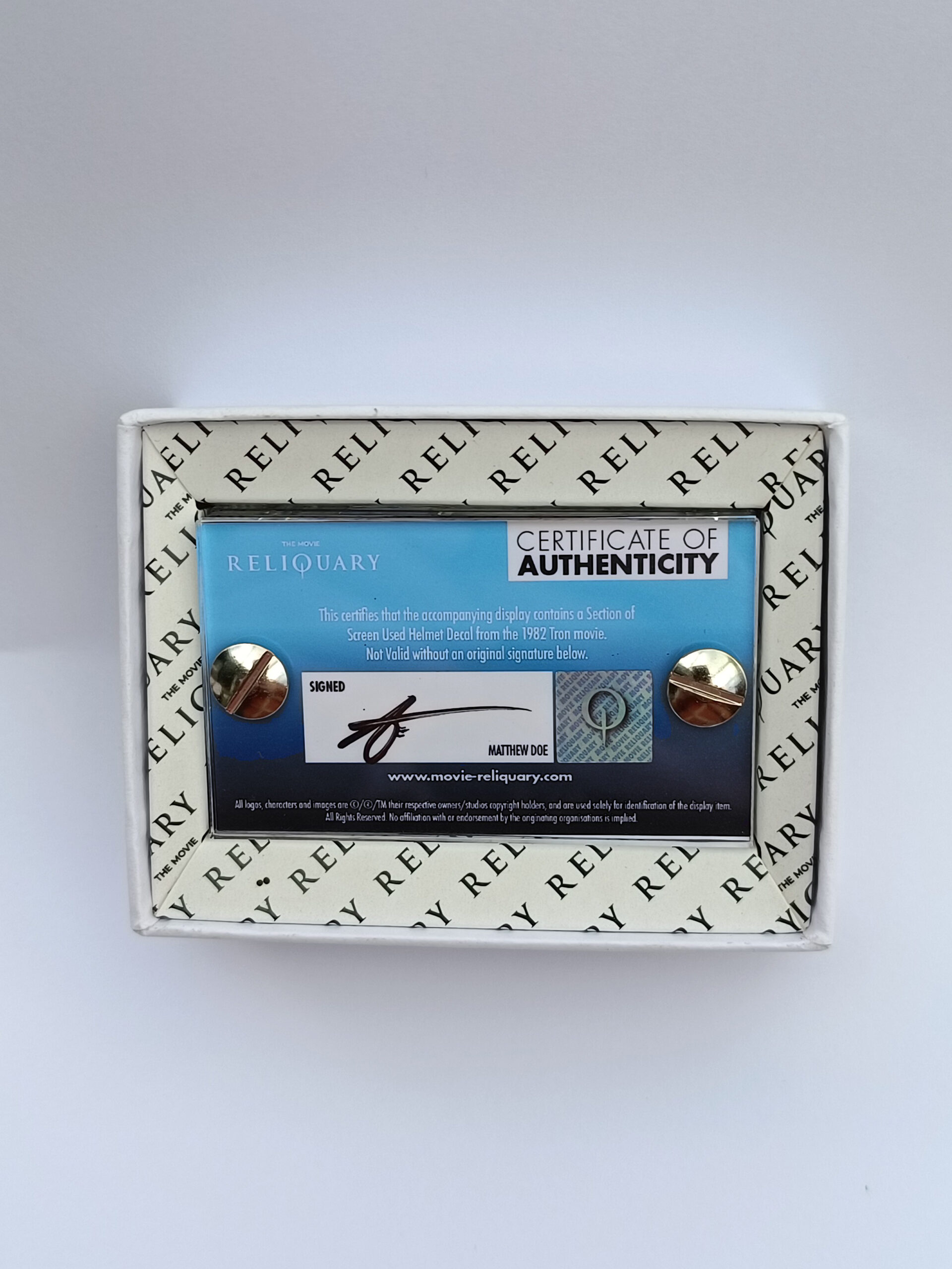 Tron 1982 Screen Used Movie Prop Helmet Decal With Movie Reliquary COA and copy of original Propmasters COA.